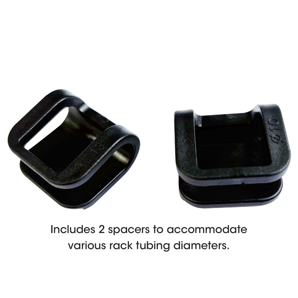 Includes 2 spacers to accommodate various rack tubing diameters