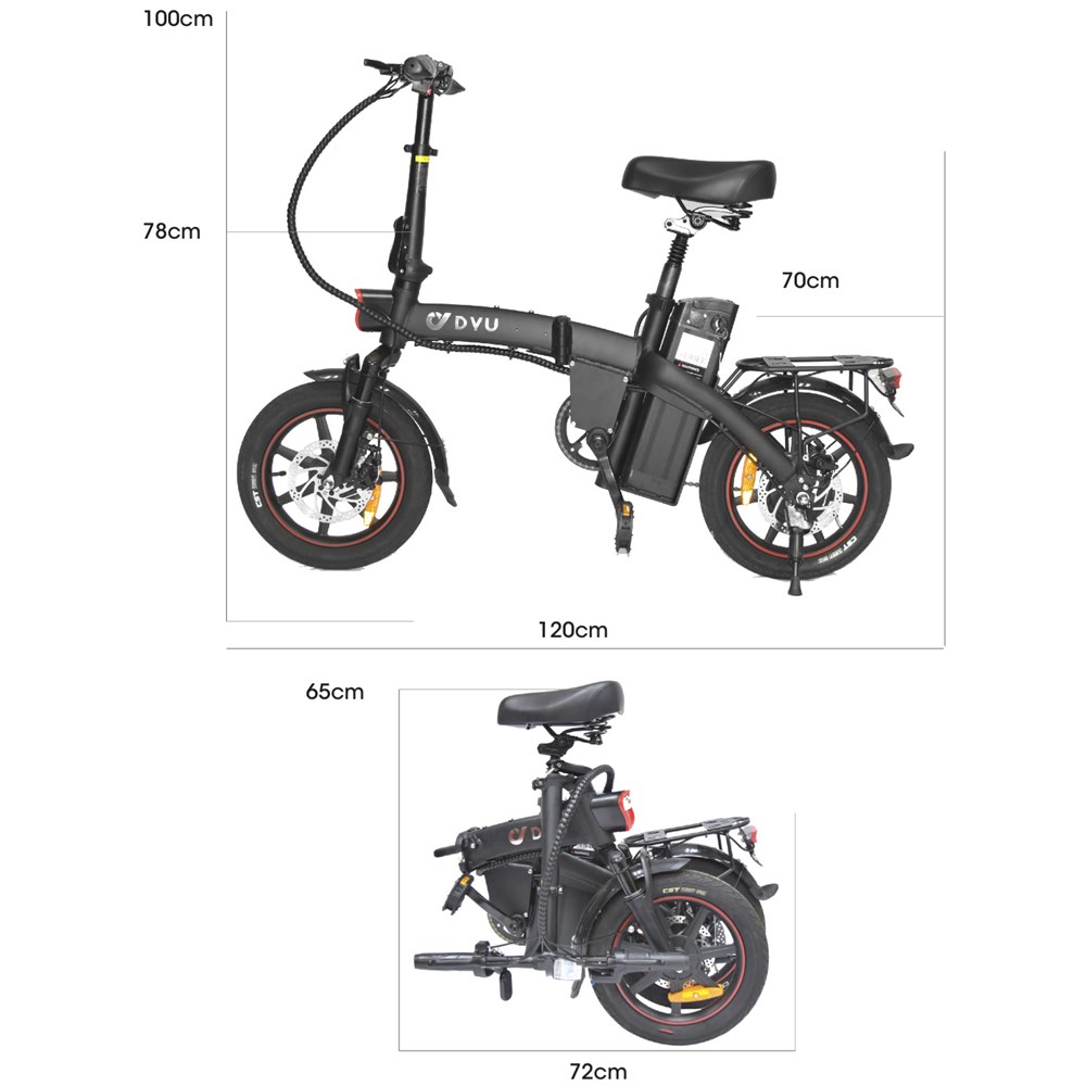 The A5 also features a comfortable shock absorbing seat as well as front shock absorbers to give you a smooth comfortable ride. The A5 is the only DYU Electric Bike with 3 Stage Folding ability by being able to lower the seat, fold over the handlebars and then literally fold the bike in half! This gives you ultra compact storage for travelling long distance in a car or storing in the home/office.