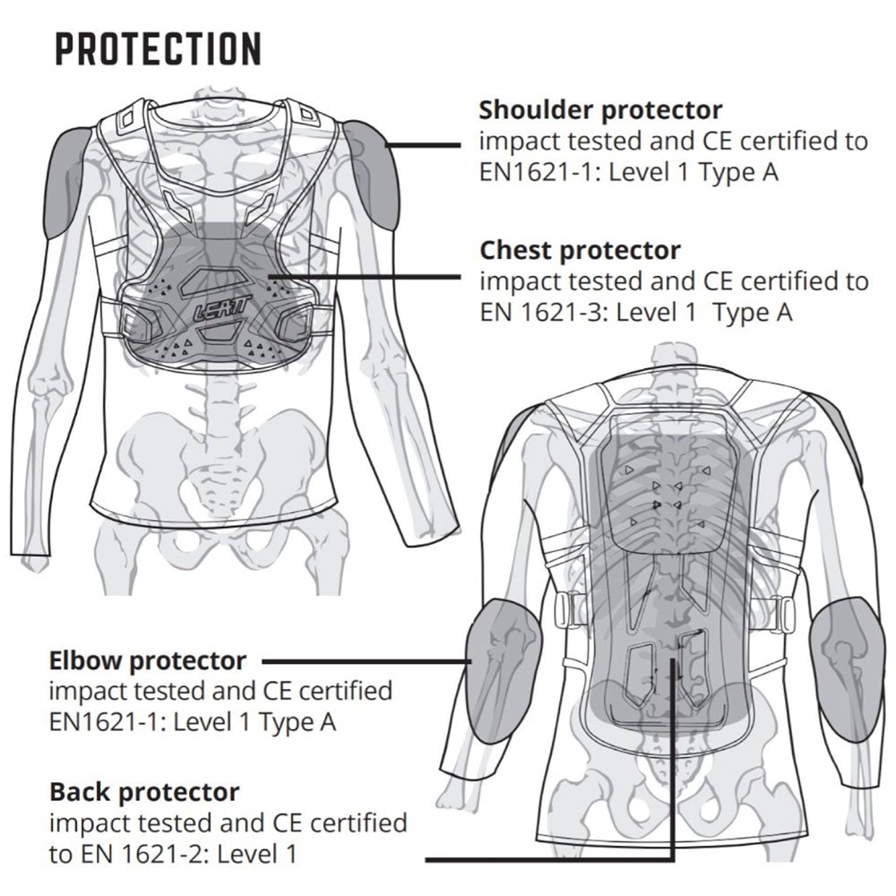 Modular protection system that comes in 2 pieces, it will not only give you the most efficient shielding but also great ventilation and comfort. Includes a zip-up compression sock (base layer) with soft, built-in shoulder and elbow impact guards plus a CE-Certified Leatt chest and back impact protector which is worn over the top and includes additional coverage and straps to suit the female form.