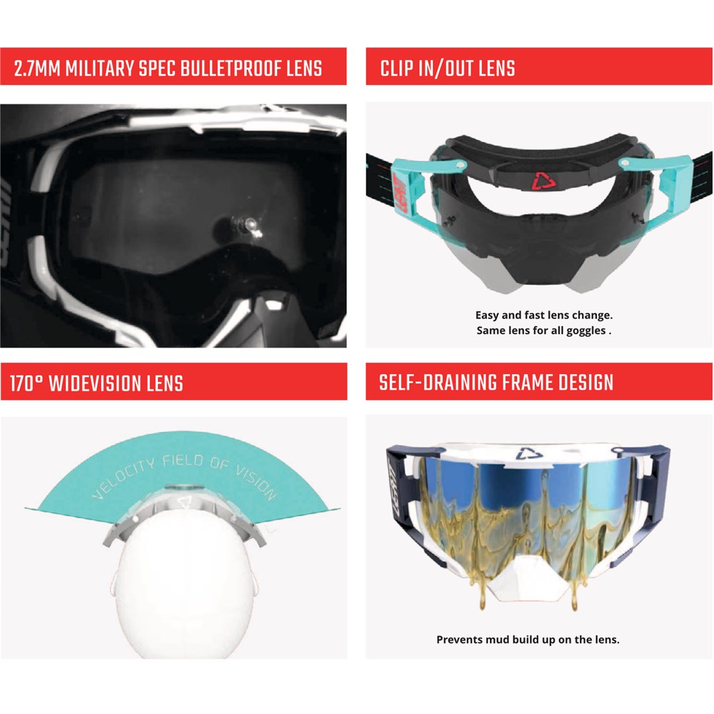 The Velocity 4.0 MTB bicycle goggles are a complete novelty among Leatt Protectives products. They are characterized not only by great design, perfect comfort and optimization, but also forecast forecasts against any threats. The wide, ventilated RideViz lens with Anti-Fog coating provides great visibility (viewing angle up to 170 degrees!), And its bulletproof specificity guarantees safety against stones, gravel and branches available on the market yet! in foam and a unique mesh belt with a width of 40 mm. These are great goggles at a really attractive price!