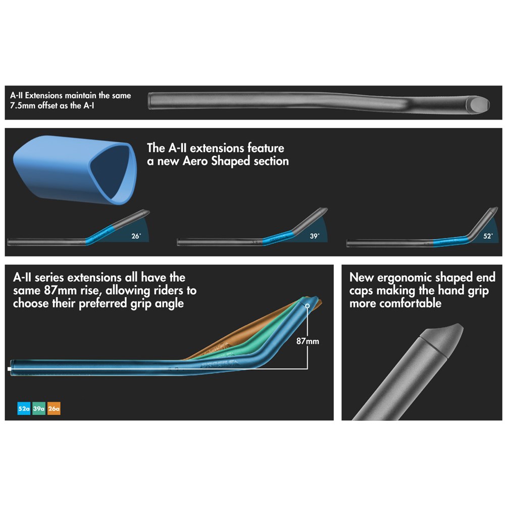The A-Series extensions now allow the rider and fitter to fine tune the wrist angle without changing other aspects of the fit. The dimensions are optimised for use with our plus series armrests. Extensions maintain the same 7.5mm offset as existing alloy aerobars. Featuring a new Aero Shaped section while mainting the same 87mm rise, allowing riders to choose their preferred grip angle. New ergonomic shaped end caps making the hand grip more comfortable.
