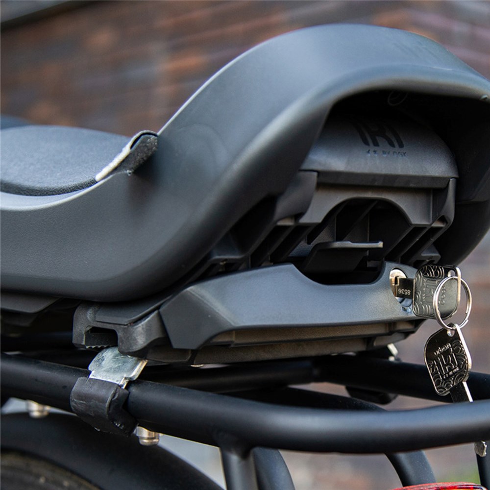 The Junior bike seat comes with an integrated lock to prevent theft. Two keys are included to easily lock the seat so it cannot be removed without permission.