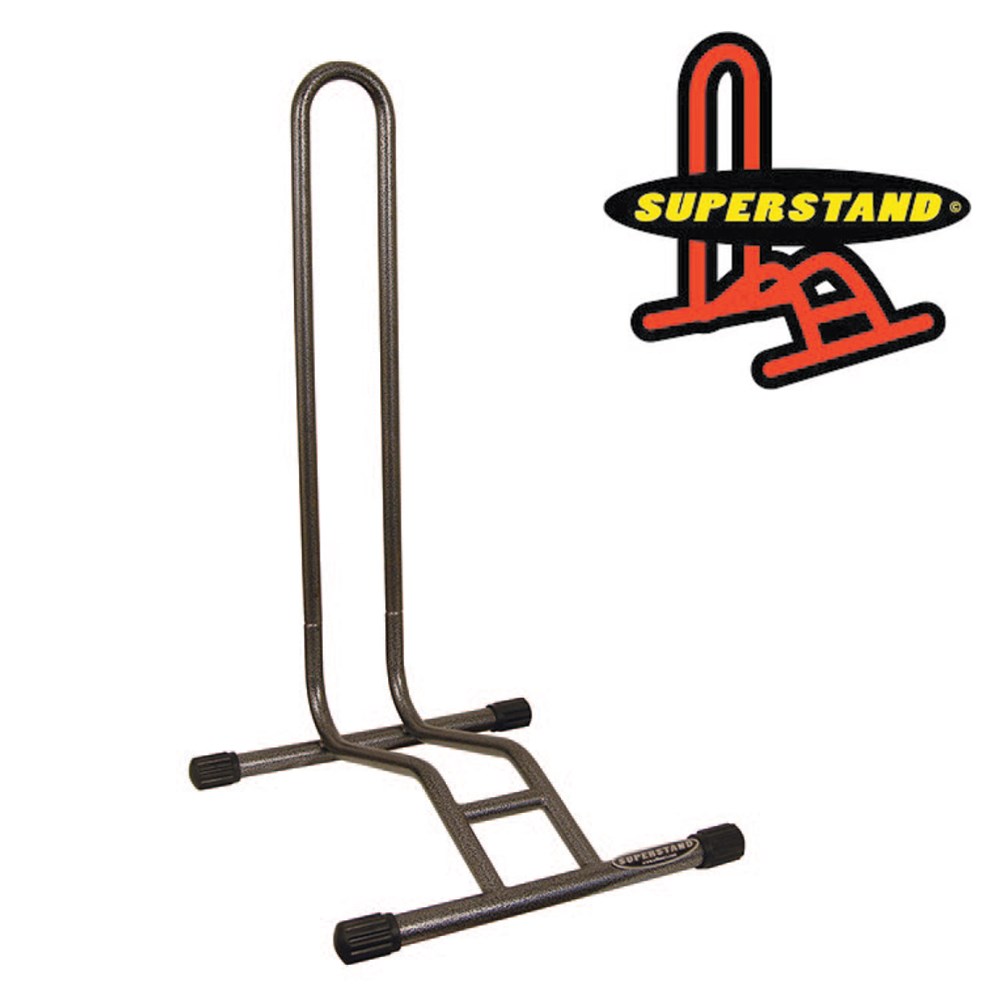 Superstand uses no more space than the bike itself - perfect when you have minimal space available. Wheel in and wheel out your bicycle with either the front or rear wheel. Providing horizontal and vertical wheel support. Superstand clears all sprockets, gears, derailleurs and brake discs etc. Made from powder-coated, strong tubular steel.