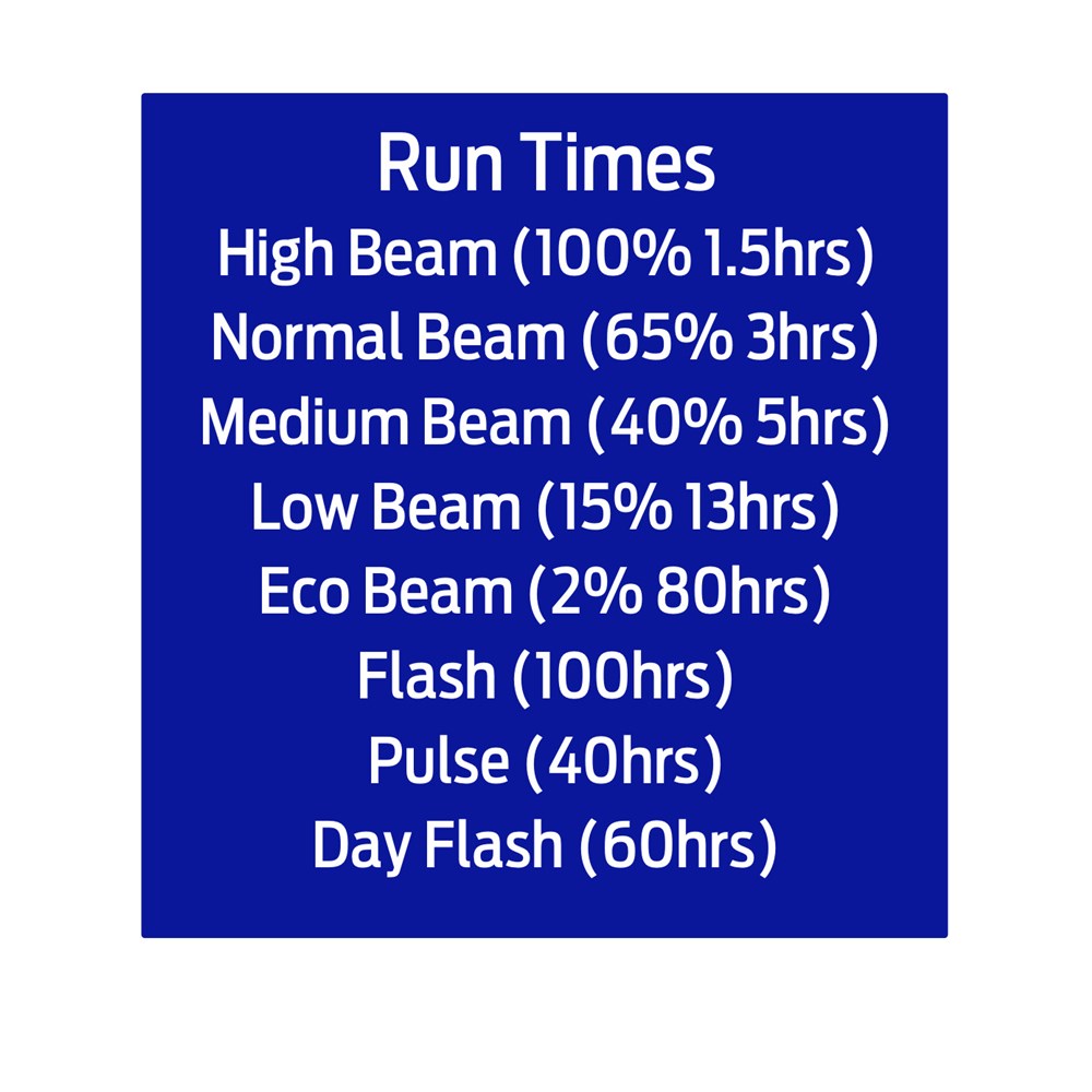 • High Beam (100% 1.5hrs)
