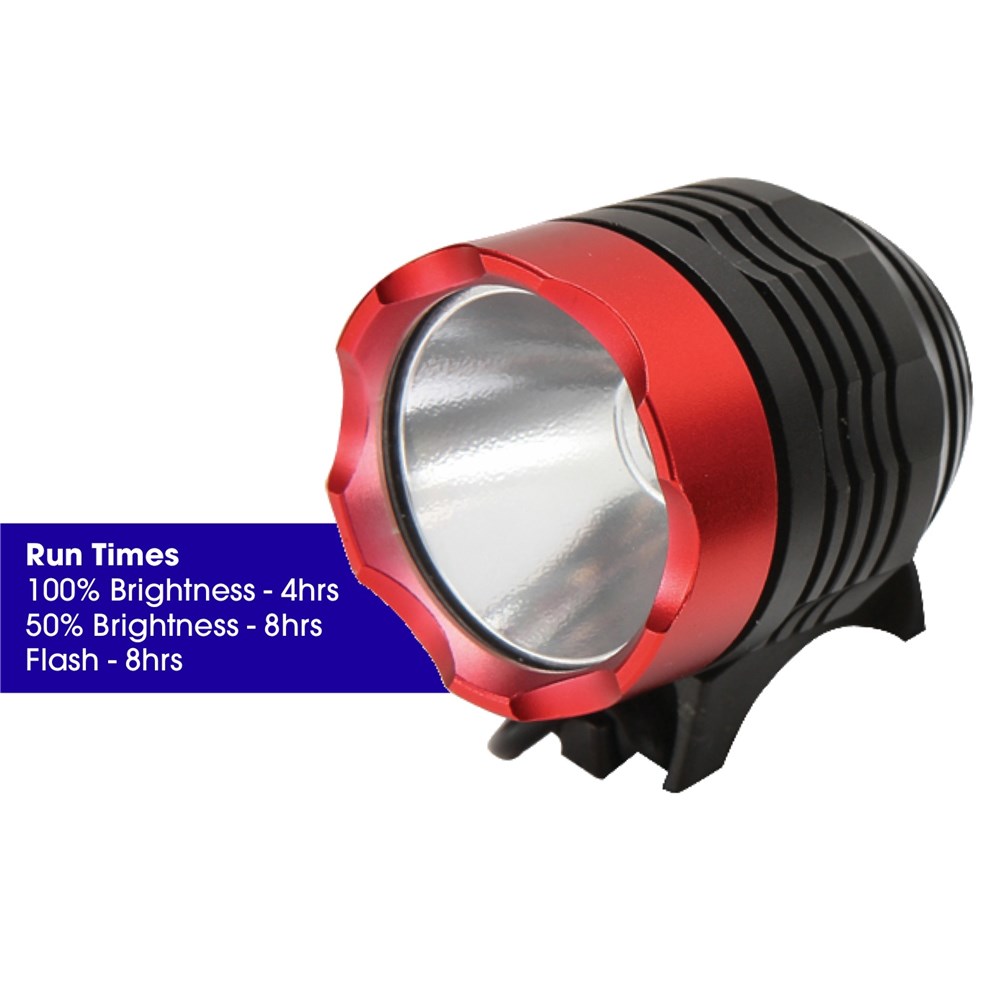3 Modes: 100% Brightness - 4hrs 50% Brightness - 8hrs Flash - 8hrs