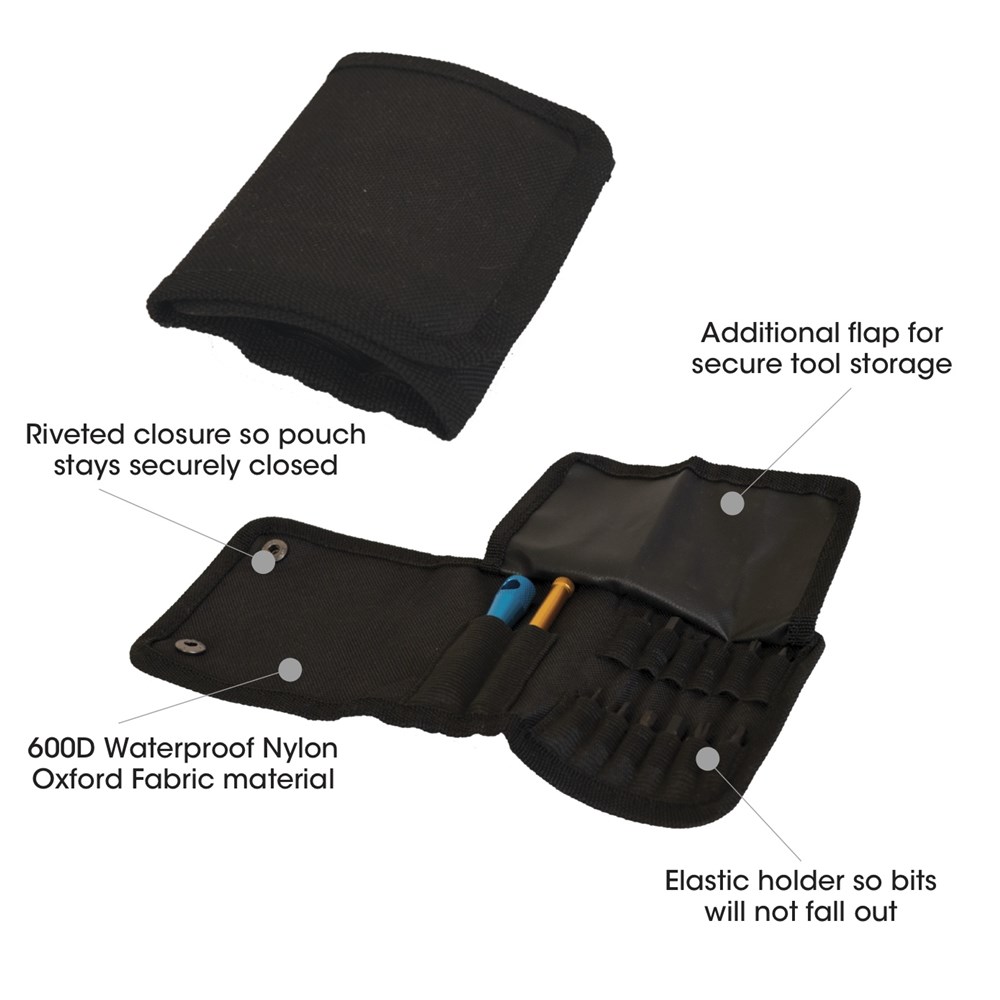 End screws off so tool can be stored in pouch.