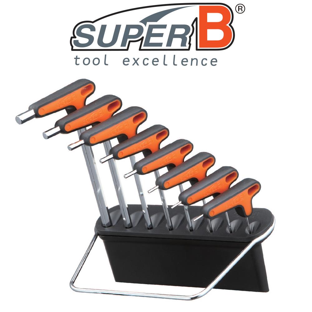 Unique T/L handle hex set is specially designed by SuperB. Made of shock resistant steel, heat-treated with dual density molded handles suited for leverage, comfort and control. High torque and high hardness for durable service. Bench mount and wall mount holder keep wrenches organized right at your fingertips