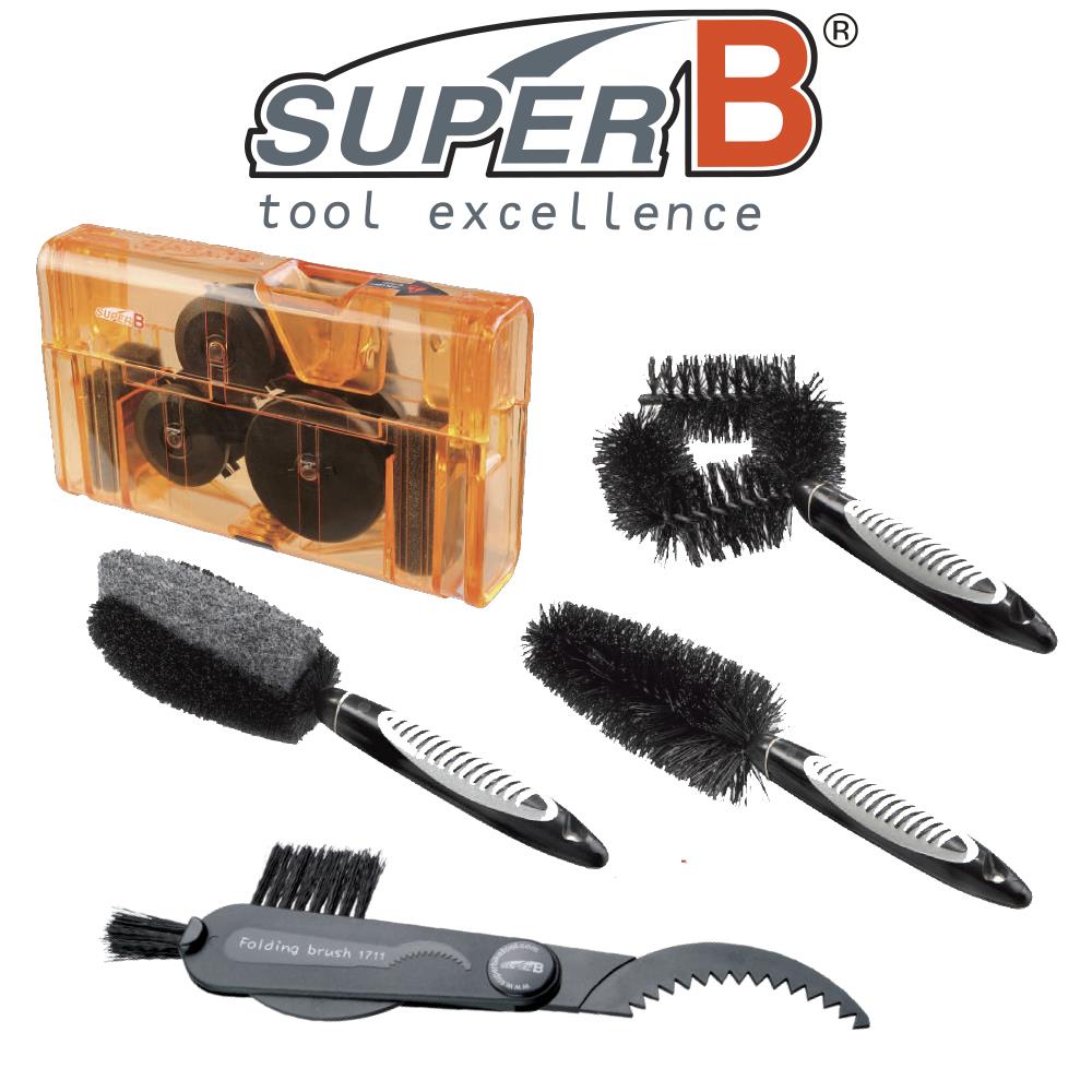 Functional Super B brushes and chain cleaning tool packed with a draw-string bag. For maintainance of chain, freewheel, chainring, deraileur and tyres.