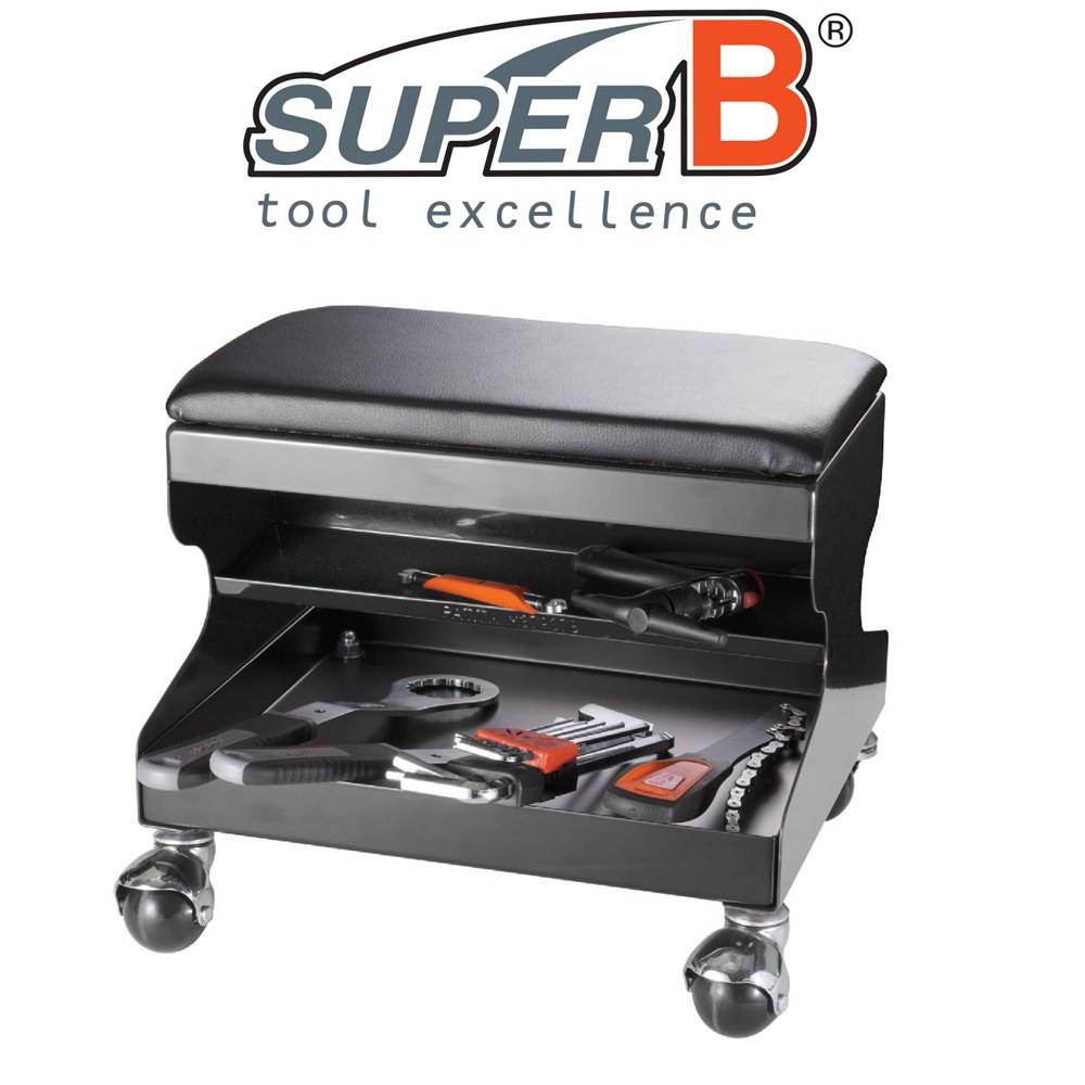 Designed with soft cushion to help mechanics work efficiently and to move around freely. Two convenient storage spaces for necessary tools and parts. Features ball wheel design for moving around work places easier. Height: 310mm. Tools are not included.