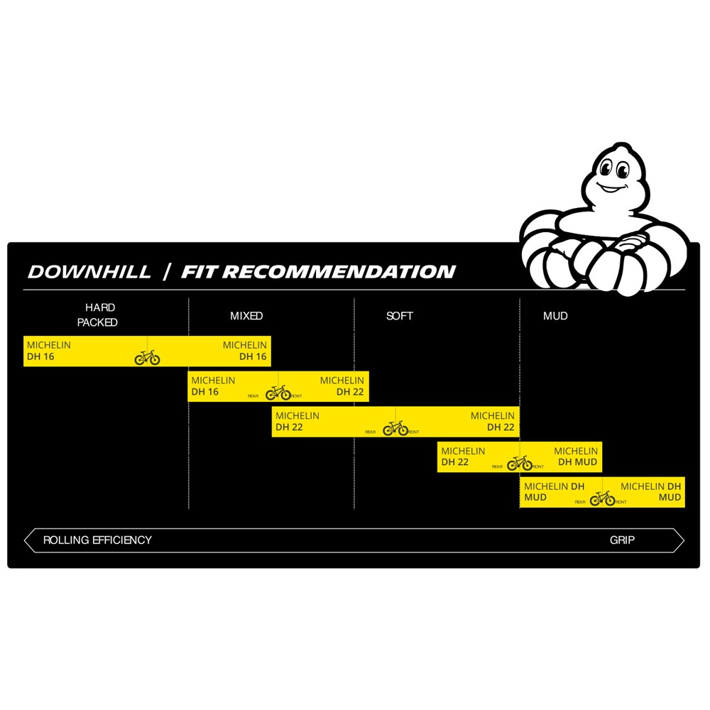 The most versatile Downhill tyre in the Michelin range. Excellent on soft and mixed terrain, it gives you a good level of performance on hard terrain.