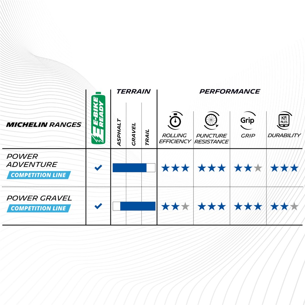 Explore for longer with the Gum-X technology and Power Adventure tread pattern combination; the best wear performance of the Gravel range