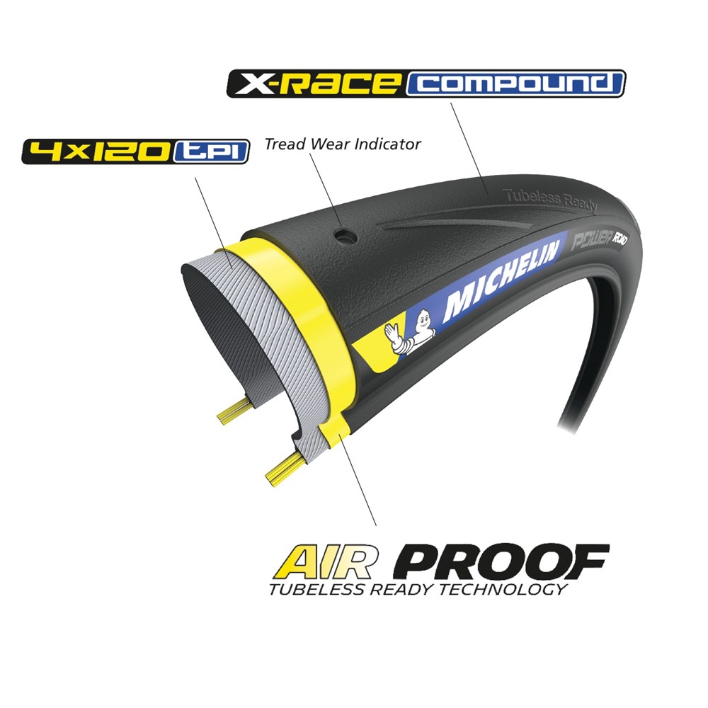 The Air Proof layer increases puncture resistance as well as increasing the ability of the tyre to hold air. Sealant is still required if running tubeless. X-Race compound is a new technology Michelin have developed that provides the same lateral grip as the Power Endurance tyre and the same legendary rolling efficiency of the Power Competition. The casing features 4 x 120TPI which provides high strength but remains supple for superb handling at high speeds.