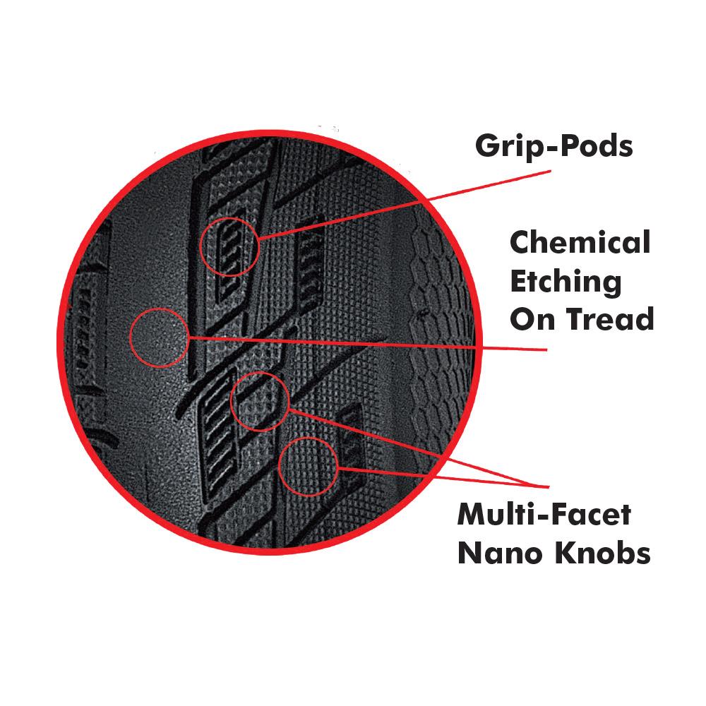 • Grip-Pods: Pressure-sensitive traction system featuring sticky bristle knobs encased within a recess enabling an ultra-low tread profile with traction coming alive through applied force. Grip-Pods activate automatically with natural riding motion for on-demand traction with minimal disruption to forward momentum.